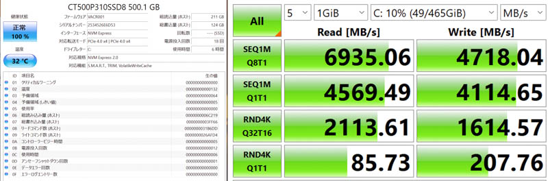 速度 SeqRead:6935MB/s SeqWrite:4718MB/s