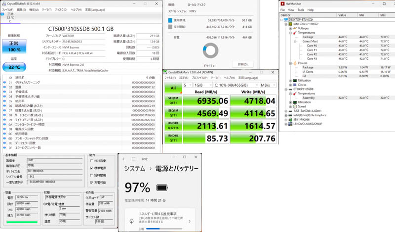 - ACケーブルを外して、バッテリチェック、残り使用可能時間は14h21mと表示