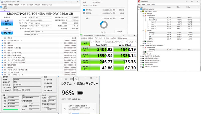 - ACケーブルを外して、バッテリチェック、残り使用可能時間は16h53mと表示